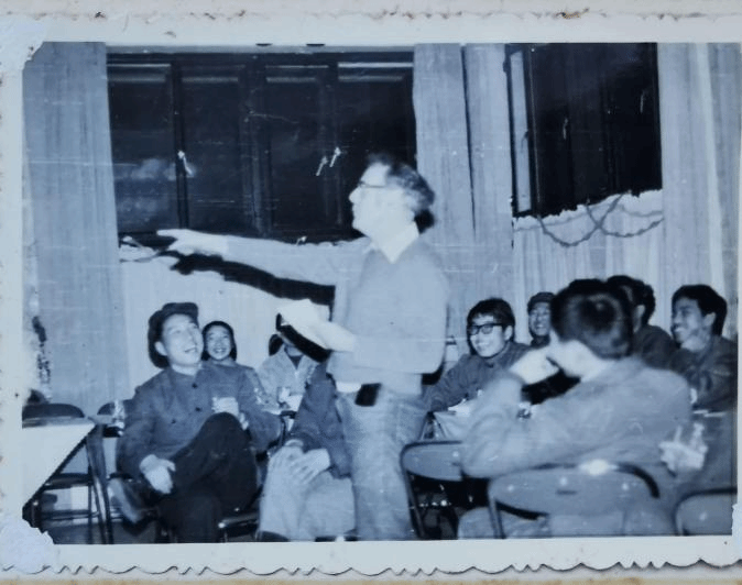 1982年元旦,班主任嵇纬武老师(左一)、牛顿教授(站立者)组织81科英在专家楼(现校友之家)联欢(81科英罗军同学收藏)