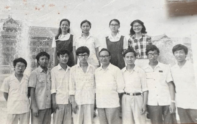 吉瑞芝老师(后排中)给81科英讲课后与部分师生合影。后排左四赵金垣老师(外语系第一届党总支书记)、后排右四王静华老师(分管学生工作的党总支副书记)、后排左一班主任嵇纬武老师
