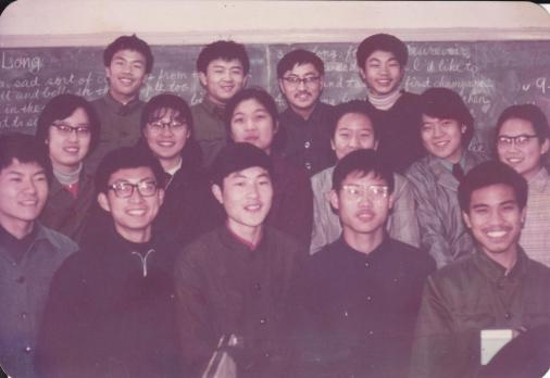 81科英苏建华同学收藏的由Allen West (口语老师)1982年拍摄的81科英A B班合照。Allen West将胶片带到香港冲洗,送每位同学一张。这是大多数同学人生的第一张彩色照片。