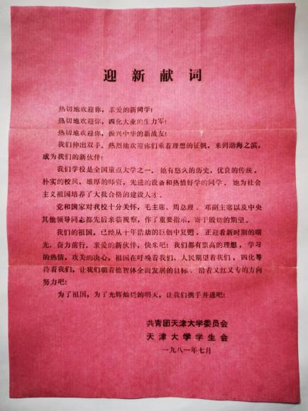 爱国奉献、兴学强国的传统植根于心。迈入天大校园的第一天,六里台小广场悬挂的迎新横幅赫然写着“欢迎你 振兴中华的新战友”“欢迎你,祖国未来的栋梁”“欢迎你 四化大业的主力军”。我年轻的心受到深深的震撼,仿佛感受到了80年代新一辈所肩负的历史责任,于是暗下决心,要努力学习、报效国家。