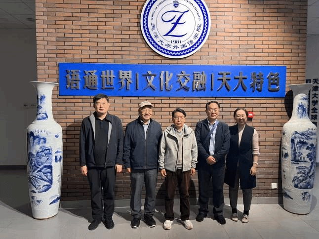 2025年5月,81科英、83科英同学在母校外国语学院大楼与院领导张文礼书记(前排右一)、王立松院长(前排左一)合影
