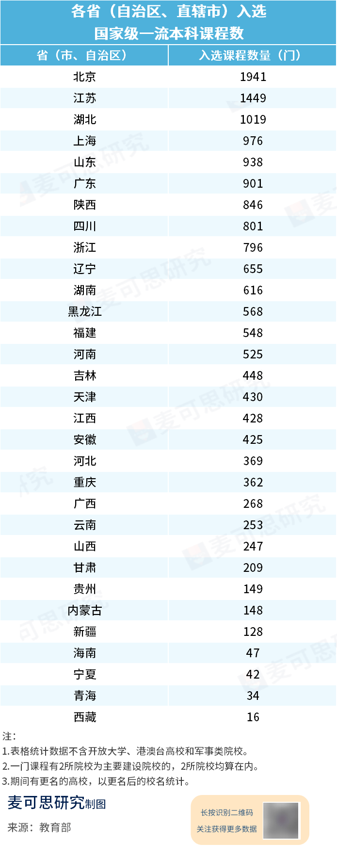 从各省(自治区、直辖市)入选的课程数量来看,北京入选数量最多,有1941门课程入选。江苏(1449门)、湖北(1019门)也均有超过1000门课程入选。具体到各城市(不含直辖市),南京入选课程数量最多,有927门入选。其次是武汉,有901门课程入选。广州(740门)、西安(739门)、成都(654门)、杭州(559门)入选的课程数量也都超过500门。