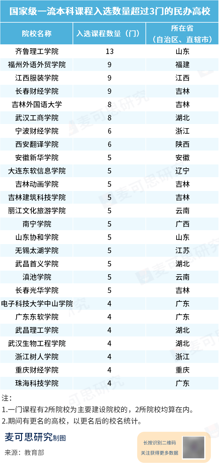 根据统计,共有171所民办院校入选了386门课程。其中齐鲁理工学院入选的国家级一流本科课程数量最多,有13门课程入选。其次是福州外语外贸学院、江西服装学院、长春财经学院,均有9门课程入选。