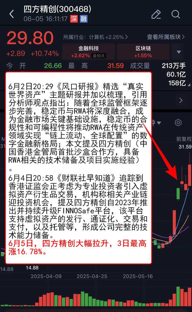 6月4日20:58《财联社早知道》 追踪到香港证监会正考虑为专业投资者引入虚拟资产衍生品交易,机构称相关产业链迎投资机会,提及四方精创自2023年推出并持续升级FINNOSafe平台,该平台支持虚拟资产的发行、通证化、交易和支付,以及托管等,形成公司完整的技术能力储备。
