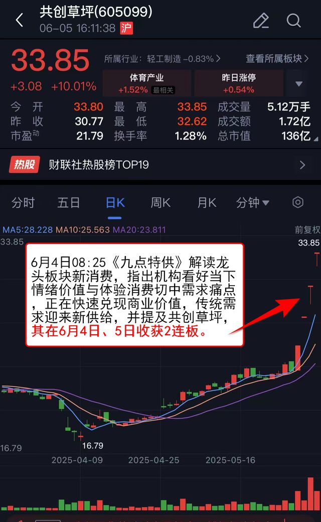 6月4日08:25《九点》 解读龙头板块新消费,指出机构看好当下情绪价值与体验消费切中需求痛点,正在快速兑现商业价值,传统需求迎来新供给,并提及共创草坪,其在6月4日、5日收获2连板。