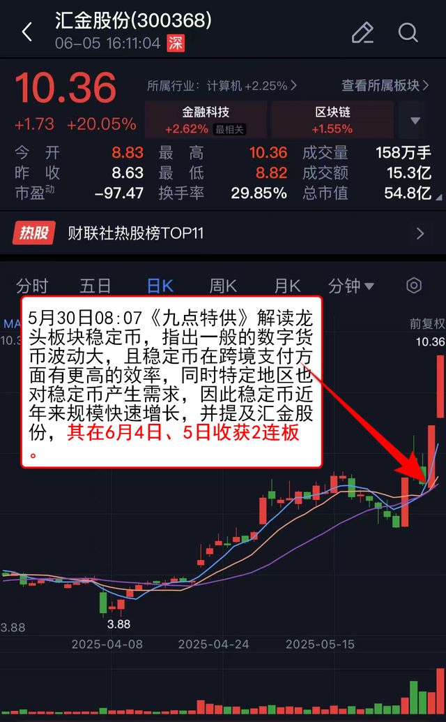 5月30日08:07《九点》 解读龙头板块稳定币,指出一般的数字货币波动大,且稳定币在跨境支付方面有更高的效率,同时特定地区也对稳定币产生需求,因此稳定币近年来规模快速增长,并提及汇金股份,其在6月4日、5日收获2连板。