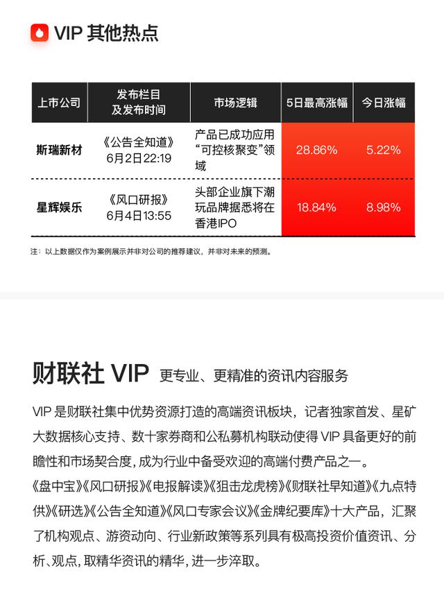 注:财联社VIP为内容资讯产品,并非投资建议。以下内容仅为资讯价值展示非对相关公司的推荐建议,非未来走势预测。投资有风险,入市需谨慎。