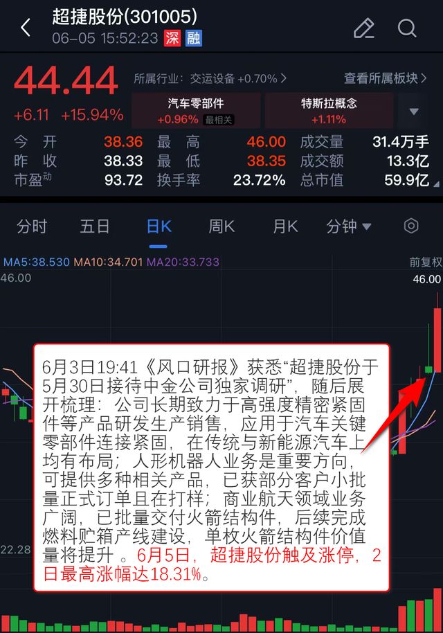 6月3日19:41《风口研报》 获悉“超捷股份于5月30日接待中金公司独家调研”,随后展开梳理:公司长期致力于高强度精密紧固件等产品研发生产销售,应用于汽车关键零部件连接紧固,在传统与新能源汽车上均有布局;人形机器人业务是重要方向,可提供多种相关产品,已获部分客户小批量正式订单且在打样;商业航天领域业务广阔,已批量交付火箭结构件,后续完成燃料贮箱产线建设,单枚火箭结构件价值量将提升 。6月5日,超捷股份触及涨停,2日最高涨幅达18.31%。