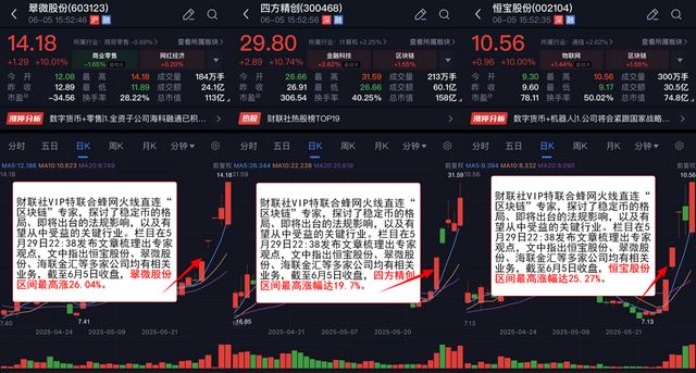 财联社VIP特联合蜂网火线直连“区块链”专家,探讨了稳定币的格局、即将出台的法规影响,以及有望从中受益的关键行业。栏目在5月29日22:38发布文章梳理出专家观点,文中指出恒宝股份、翠微股份、海联金汇等多家公司均有相关业务,截至6月5日收盘,恒宝股份区间最高涨幅达25.27%,翠微股份区间最高涨26.04%,四方精创区间最高涨幅达19.7%。