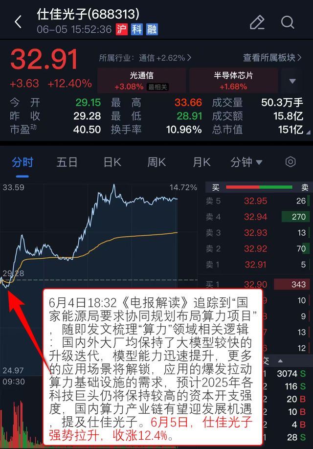 6月4日18:32《电报解读》 追踪到“国家能源局要求协同规划布局算力项目”,随即发文梳理“算力”领域相关逻辑:国内外大厂均保持了大模型较快的升级迭代,模型能力迅速提升,更多的应用场景将解锁,应用的爆发拉动算力基础设施的需求,预计2025年各科技巨头仍将保持较高的资本开支强度,国内算力产业链有望迎发展机遇,提及仕佳光子。6月5日,仕佳光子强势拉升,收涨12.4%。