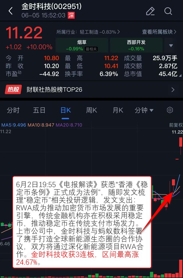 6月2日19:55《电报解读》 获悉“香港《稳定币条例》正式成为法例”,随即发文梳理“稳定币”相关投研逻辑,发文支出:RWA成为推动加密货币市场发展的重要引擎,传统金融机构亦在积极采用稳定币,推动稳定币在传统支付市场发力。上市公司中,金时科技与蚂蚁数科签署了携手打造全球新能源生态圈的合作协议,双方将通过深化新能源项目RWA合作。金时科技收获3连板,区间最高涨24.67%。